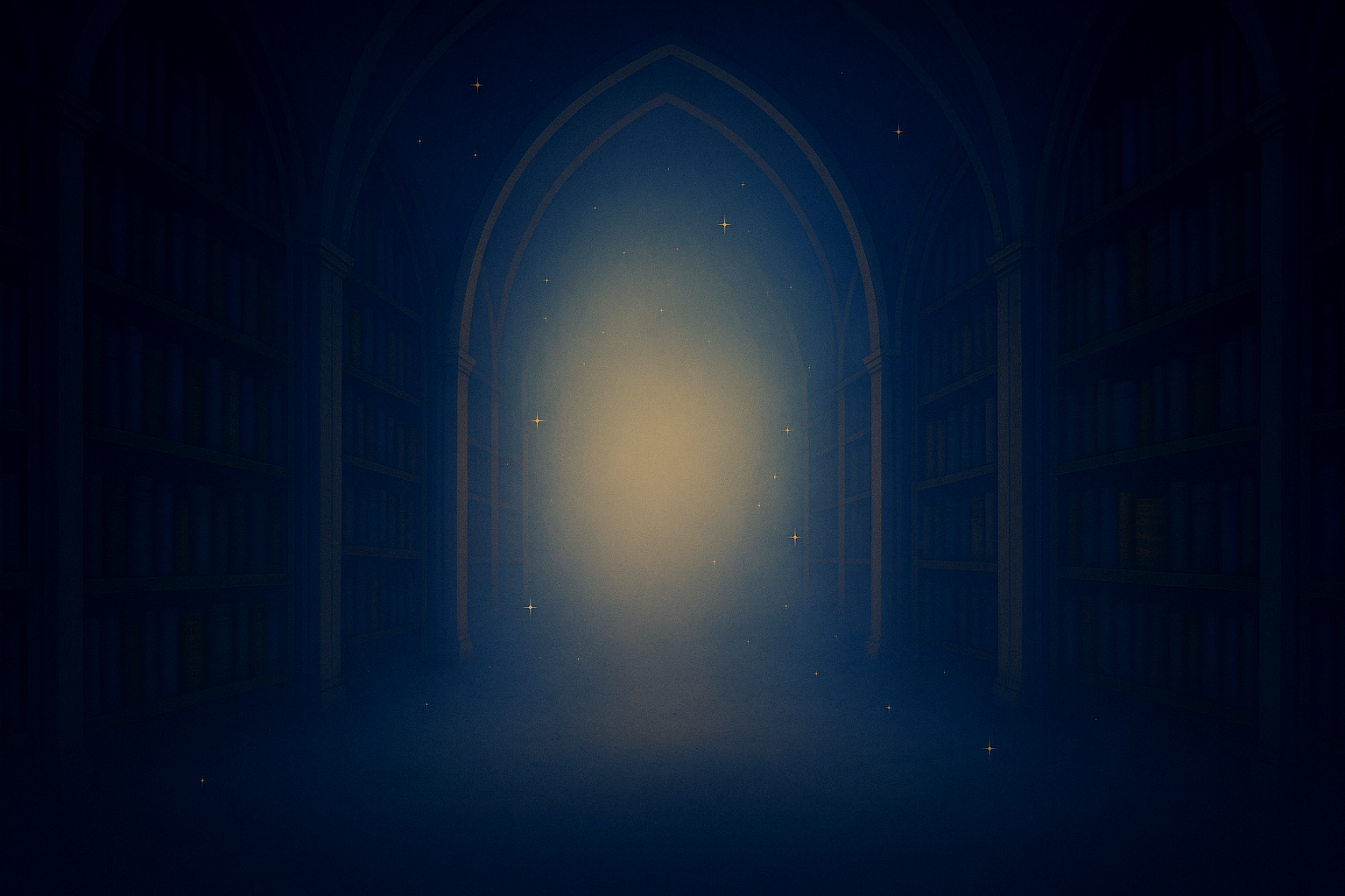 A wooden shelf with three books inside a dimly lit room. The wall behind the shelf is painted with a starry sky pattern, and a dark curtain is partially visible on the left side.